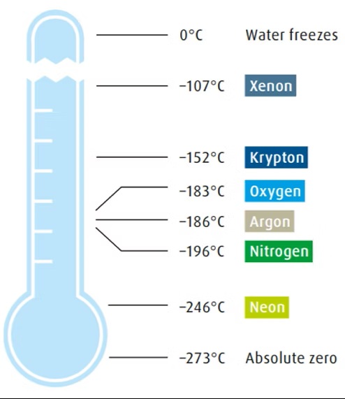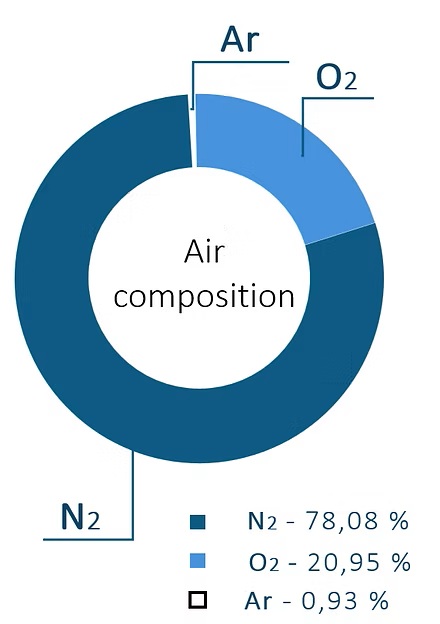 Product: instrument air, liquid and gaseous Oxygen (O2), Nitrogen (N2), Argon (Ar).