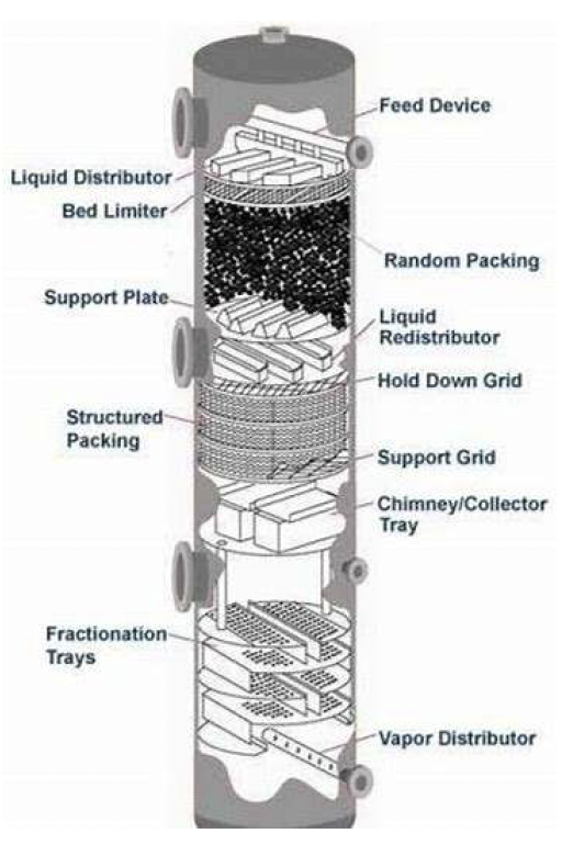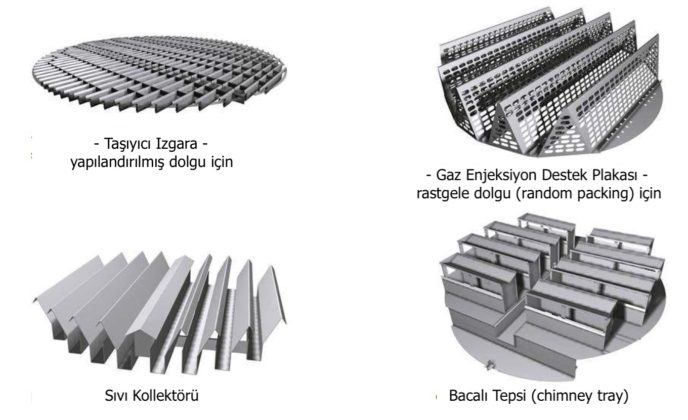 Konvansiyonel ve yüksek kapasiteli tepsiler; her türlü valf; özel gaz dağıtıcıları; demisterler (sis tutucular); plaka ayırıcılar